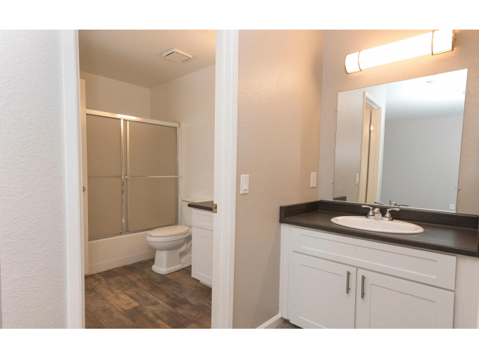 Residence 2: Two Bedroom / One Bath 821 Sq. Ft. A graceful window adorns the large modern kitchen which features abundant cabinets and counters. The master suite features a private vanity and sink and oversize closet. The second bedroom offers you a multitude of living options-roommate, home office, nursery, hobby room, you name it-it works.